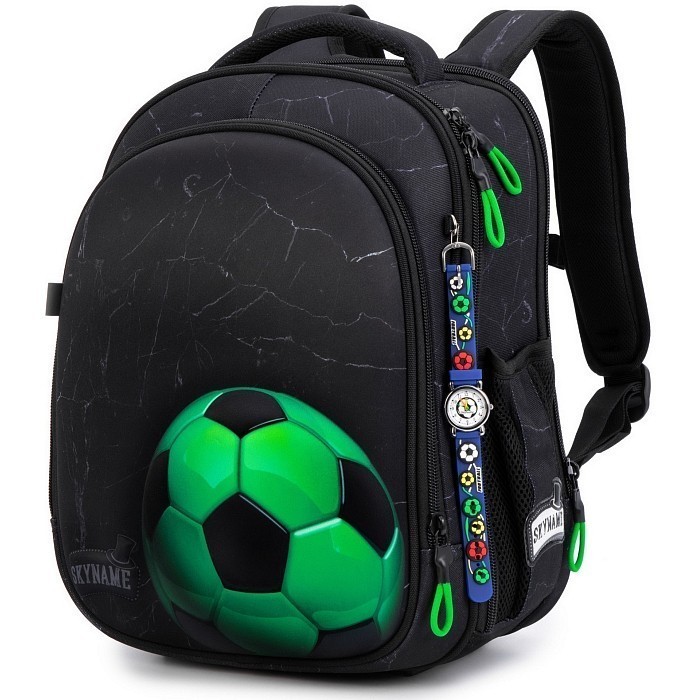 Ранец+часы SkyName – это идеальный выбор для юных школьников! Изготовленный из прочного полиэстера, он украшен ярким футбольным мячом и зелеными молниями. Черная основа с яркими акцентами создает модный и удобный образ. Бренд SkyName, известный своими качественными продуктами из США, делает этот ранец отличным выбором для вашего ребенка! Быстрая доставка СДЭК по всей России.