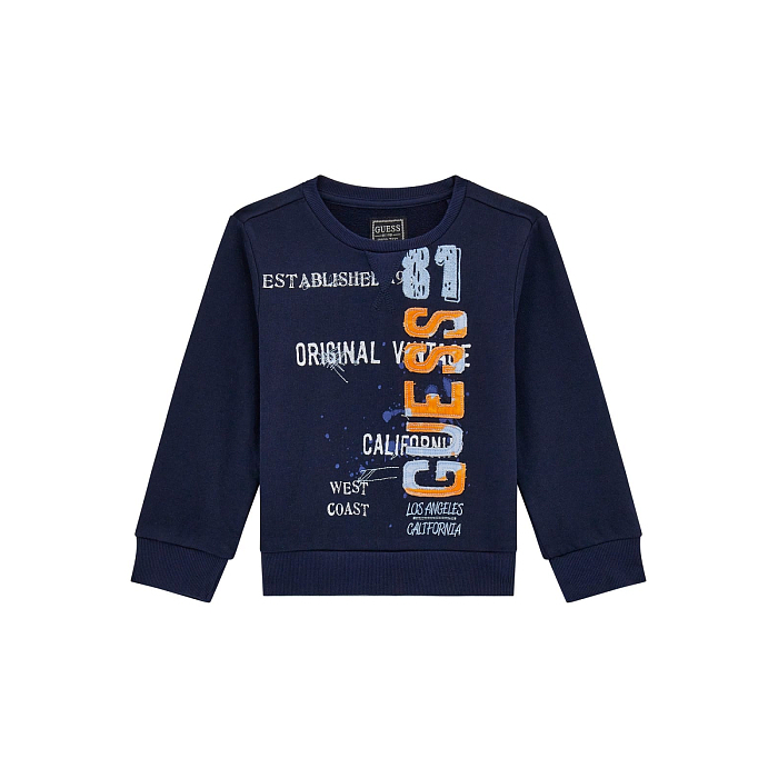 Джемпер Guess темно-синего цвета – идеальный выбор для детей! Изготовлен из 100% хлопка, он украшен оригинальным принтом с надписями "ESTABLISHED 1981", "ORIGINAL VALUE" и "GUESS". Джемпер с круглым вырезом и длинными рукавами подойдет для мальчиков в возрасте от 4 до 6 лет. На фотографиях видна аккуратная отделка края рукавов и низа, а также мягкая текстура ткани. Качество от бренда Guess и внимание к деталям делают этот джемпер отличным выбором для вашего ребенка!