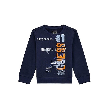 Джемпер Guess темно-синего цвета – идеальный выбор для детей! Изготовлен из 100% хлопка, он украшен оригинальным принтом с надписями "ESTABLISHED 1981", "ORIGINAL VALUE" и "GUESS". Джемпер с круглым вырезом и длинными рукавами подойдет для мальчиков в возрасте от 4 до 6 лет. На фотографиях видна аккуратная отделка края рукавов и низа, а также мягкая текстура ткани. Качество от бренда Guess и внимание к деталям делают этот джемпер отличным выбором для вашего ребенка!