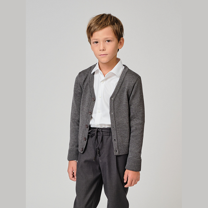 Кардиган Андерсен – это идеальный выбор для стильных мальчиков! Изготовленный из 50% хлопка и 50% полиакрила, он сочетает в себе комфорт и элегантность. Темно-серый цвет подчеркивает классический дизайн с отложным воротником и кнопками. На фотографии видна аккуратная отделка края кардигана и мягкая текстура ткани. Качество от бренда из Дании делает этот кардиган отличным выбором для вашего ребенка!