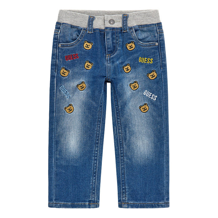 Джинсы Guess – это идеальный выбор для маленьких модников! Изготовленные из 81% хлопка, 17% полиэстера и 2% эластана, они украшены очаровательными медведями разных цветов на светло-синем фоне. Мягкая резинка на поясе обеспечивает удобную посадку, а классический крой подчеркивает стильный образ. На фотографиях видны аккуратные вышивки медведей с разными цветами и логотипом Guess на заднем кармане. Качество от бренда из США и внимание к деталям делают эти джинсы отличным выбором для вашего мальчика!