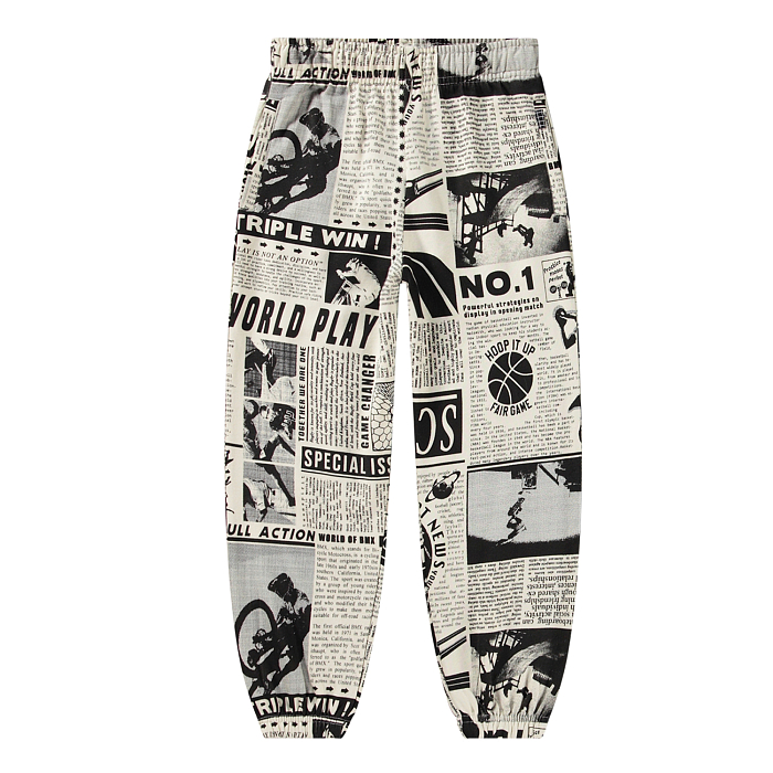 Брюки тр. для мальчиков Molo – это идеальный выбор для активных детей! Изготовленные из 100% натурального хлопка, они украшены черно-белым газетным принтом с изображениями спортивных событий, надписями и фотографиями. Нежная белая основа с черными и белыми акцентами создает современный и модный образ. На фотографиях видна эластичная резинка по талии и мягкая текстура ткани. Качество от бренда из Дании и внимание к деталям делают эти брюки отличным выбором для вашего ребенка!
