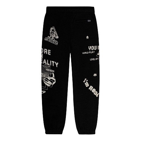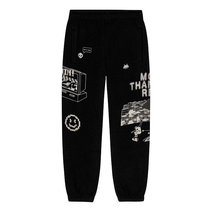 Трикотажные брюки Molo – это идеальный выбор для мальчиков! Изготовленные из 80% хлопка и 20% полиэстера, они украшены ярким дизайном в стиле 80-х. На брюках видны различные элементы: телевизор, улыбка, космические ракеты, надписи "More than reality" и "I'm real". Нежная черная основа с белыми деталями создает уникальный и в то же время уютный образ. На фотографиях видна эластичная резинка по низу и удобная посадка. Качество от бренда из Дании и внимание к деталям делают эти брюки отличным выбором для вашего ребенка!
