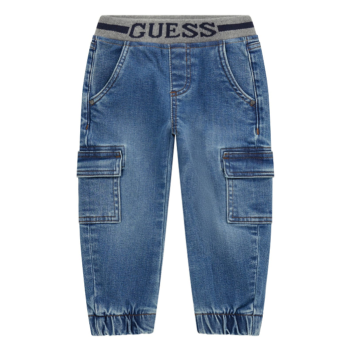 Брюки типа джинсы Guess – это идеальный выбор для мальчиков! Изготовленные из 92% хлопка, 7% эластомультиэстер и 1% эластан, они идеально подойдут для активного образа жизни. Темно-синий цвет создает классический и модный образ. На фото видна удобная посадка, мягкая эластичная резинка и стильные карманы. Бренд Guess известен своими качественными деталями и стильным дизайном, что делает эти брюки отличным выбором для вашего ребенка!