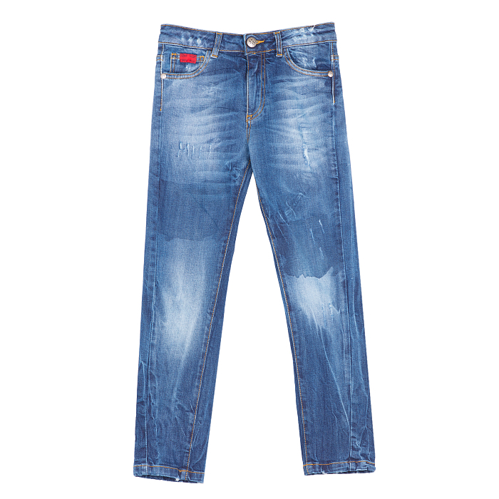 Джинсы для мальчиков John Richmond – это идеальный выбор для юных модников! Изготовленные из 99% хлопка и 1% эластана, они обеспечивают идеальную посадку и комфорт. Темно-синий цвет джинсов подчеркивает их стильный и современный дизайн. На фото видны характерные детали: красная нашивка на заднем кармане, логотип бренда на поясе и рваные детали на коленях. Джинсы идеально подходят для детей 8 лет (рост 128 см).
