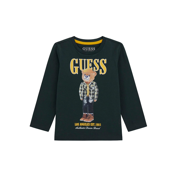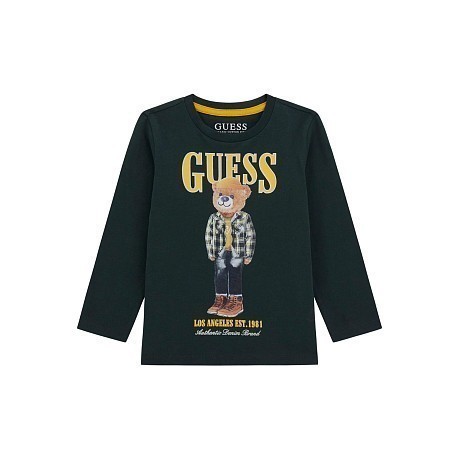 Фуфайка Guess – это идеальный выбор для мальчиков! Изготовленная из 100% хлопка, она украшена милым принтом медведя в клетчатой рубашке и джинсах, а также надписью Los Angeles. Темно-зеленая основа с ярким принтом создает стильный и комфортный образ. На фотографиях видна аккуратная окантовка по краю и мягкая текстура ткани. Качество от американского бренда Guess делает эту фуфайку отличным выбором для вашего ребенка!