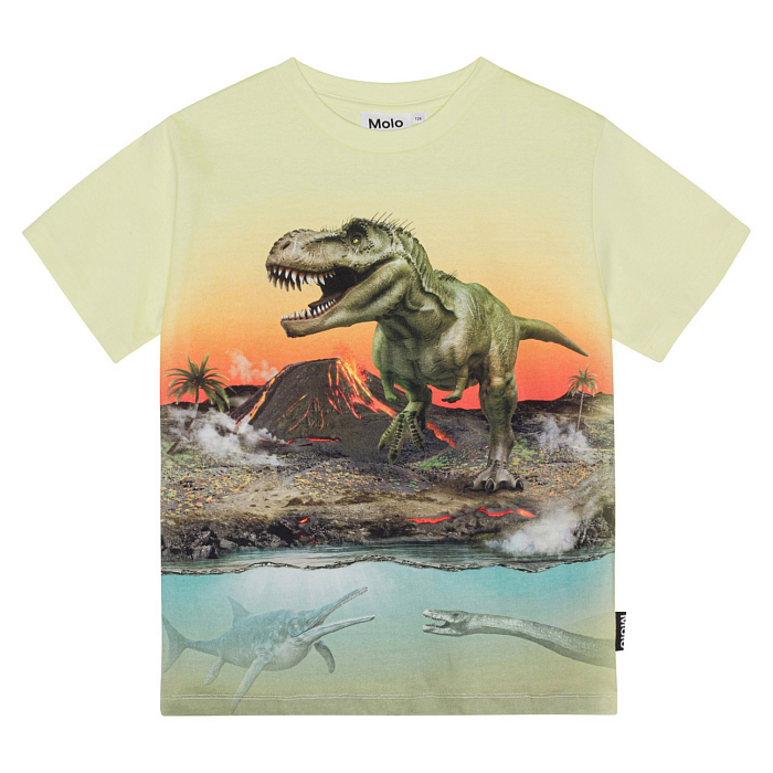 Футболка Molo – это идеальный выбор для юных динозавров! Изготовленная из 100% натурального хлопка, она украшена ярким принтом с динозаврами, вулканом и палеонтологическими элементами на светло-желтом фоне. Нежная текстура ткани и удобная посадка делают эту футболку отличным выбором для вашего ребенка!