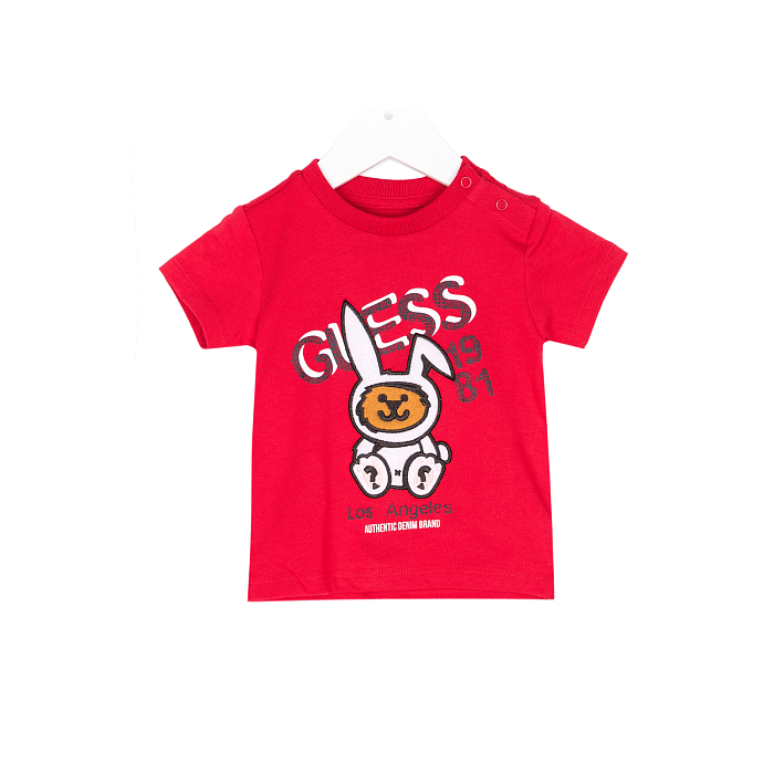 Футболка Guess – это идеальный выбор для маленьких модников! Изготовленная из 100% хлопка, она украшена очаровательным принтом кролика с надписью "1981" и логотипом Guess. Нежная красная основа с ярким принтом создает игривое и в то же время стильное настроение. На фотографиях видна аккуратная окантовка по краю и мягкая текстура ткани. Качество от бренда из США и внимание к деталям делают эту футболку отличным выбором для вашего малыша!