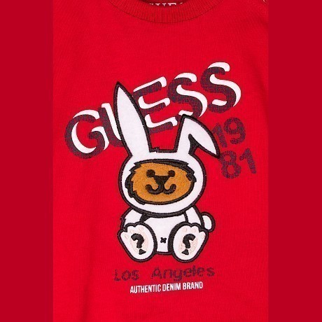 Футболка Guess – это идеальный выбор для маленьких модников! Изготовленная из 100% хлопка, она украшена очаровательным принтом кролика с надписью "1981" и логотипом Guess. Нежная красная основа с ярким принтом создает игривое и в то же время стильное настроение. На фотографиях видна аккуратная окантовка по краю и мягкая текстура ткани. Качество от бренда из США и внимание к деталям делают эту футболку отличным выбором для вашего малыша!