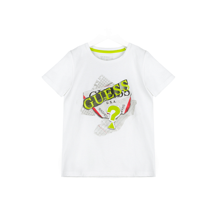 Футболка Guess – это идеальный выбор для мальчиков! Изготовленная из 100% хлопка, она украшена ярким принтом с логотипом Guess и надписью "U.S.A." на белом фоне. Нежная белая основа с яркими зелеными и красными акцентами создает стильный и современный образ. На фотографиях видна аккуратная зеленая окантовка по краю и мягкая текстура ткани. Качество от бренда из США и внимание к деталям делают эту футболку отличным выбором для вашего мальчика!
