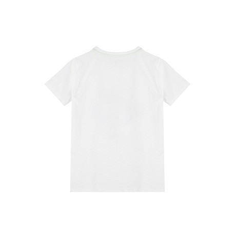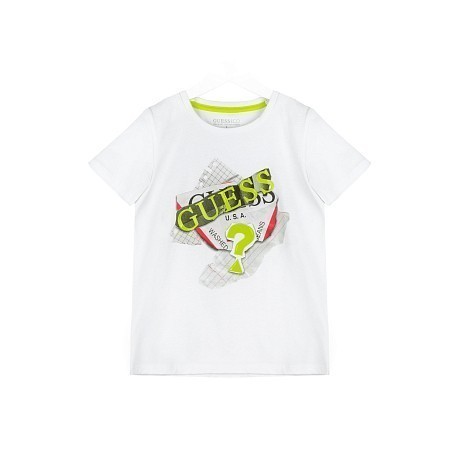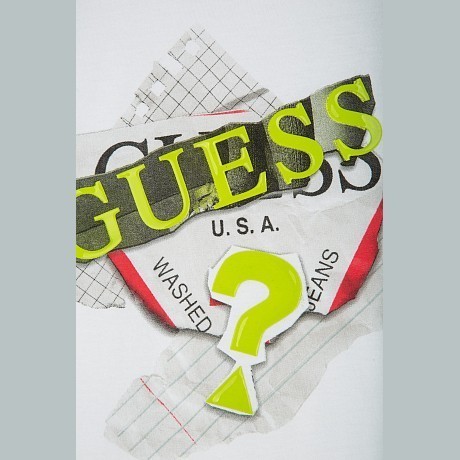 Футболка Guess – это идеальный выбор для мальчиков! Изготовленная из 100% хлопка, она украшена ярким принтом с логотипом Guess и надписью "U.S.A." на белом фоне. Нежная белая основа с яркими зелеными и красными акцентами создает стильный и современный образ. На фотографиях видна аккуратная зеленая окантовка по краю и мягкая текстура ткани. Качество от бренда из США и внимание к деталям делают эту футболку отличным выбором для вашего мальчика!