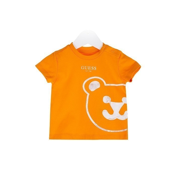 Футболка Guess – это идеальный выбор для вашего маленького друга! Изготовленная из 100% хлопка, она украшена очаровательным принтом медведя и логотипом Guess. Мягкая оранжевая основа с белым принтом медведя создает яркий и стильный образ. На фотографиях видна аккуратная белая контрастная окантовка по краю и удобная застежка на кнопки. Качество от бренда из США и внимание к деталям делают эту футболку отличным выбором для вашего ребенка!