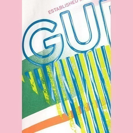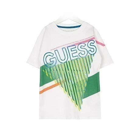 Футболка Guess – это идеальный выбор для юных модников! Изготовленная из 100% хлопка, она украшена ярким принтом с логотипом Guess и контрастными полосками. Нежная белая основа с яркими зелеными, синими и розовыми акцентами создает яркий и модный образ. На фотографиях видна аккуратная голубая контрастная окантовка по краю и мягкая текстура ткани. Качество от бренда из США и внимание к деталям делают эту футболку отличным выбором для вашего ребенка!