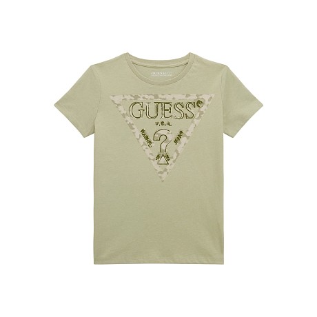 Футболка Guess – это идеальный выбор для юных модников! Изготовленная из 100% хлопка, она украшена крупным принтом логотипа Guess с золотистыми буквами и символом问号. Нежная текстура ткани и удобная посадка делают эту футболку комфортной и стильной. На фотографиях видна аккуратная вышивка логотипа и золотистые детали. Качество от бренда из США и внимание к деталям делают эту футболку отличным выбором для вашего ребенка!