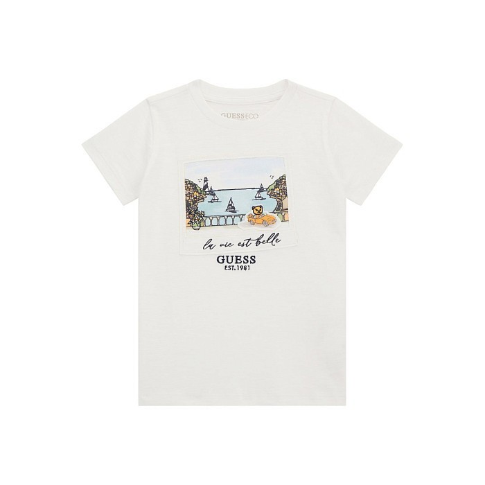 Футболка Guess – это идеальный выбор для юных модников! Изготовленная из 100% хлопка, она украшена ярким принтом морской панорамы с надписью 'La vie est belle'. Футболка с круглым вырезом и короткими рукавами идеально подходит для теплых дней. На фотографиях видна аккуратная вышивка и мягкая текстура ткани. Качество от бренда из США и внимание к деталям делают эту футболку отличным выбором для вашего ребенка!