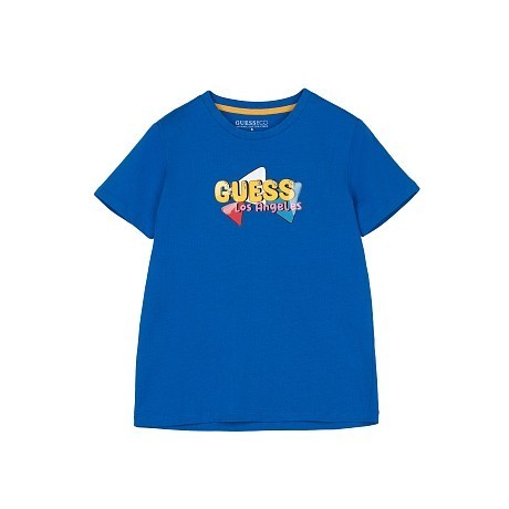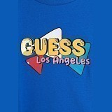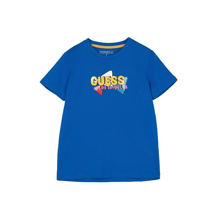 Футболка Guess – это идеальный выбор для вашего ребенка! Изготовленная из 100% хлопка, она украшена ярким принтом с надписью "Guess" и геометрическими фигурами в разных цветах. Нежная синяя основа с яркими принтами создает яркий и стильный образ. На фотографиях видна аккуратная желтая окантовка по краю и мягкая текстура ткани. Качество от бренда из США и внимание к деталям делают эту футболку отличным выбором для вашего малыша!