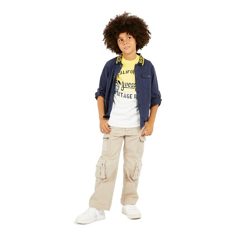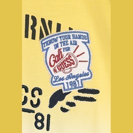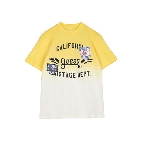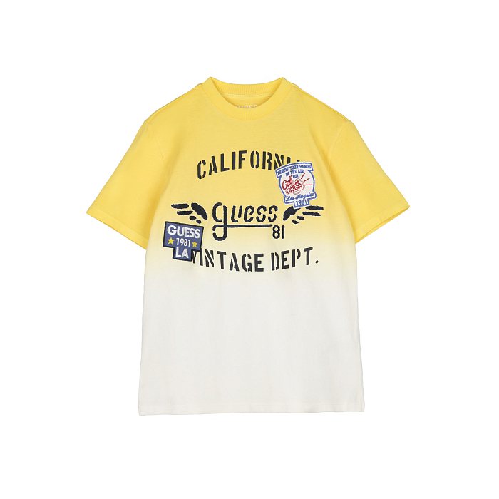 Футболка Guess – это идеальный выбор для вашего юного модника! Изготовленная из 100% хлопка, она украшена ярким принтом California Vintage Dept. с градиентным дизайном. Футболка имеет классический круглый вырез и короткие рукава, создавая комфорт и стиль. На фотографиях видны яркие элементы дизайна, такие как надпись California Vintage Dept., логотип Guess и градиентный эффект от желтого к белому. Качество от бренда из США делает эту футболку отличным выбором для вашего ребенка!
