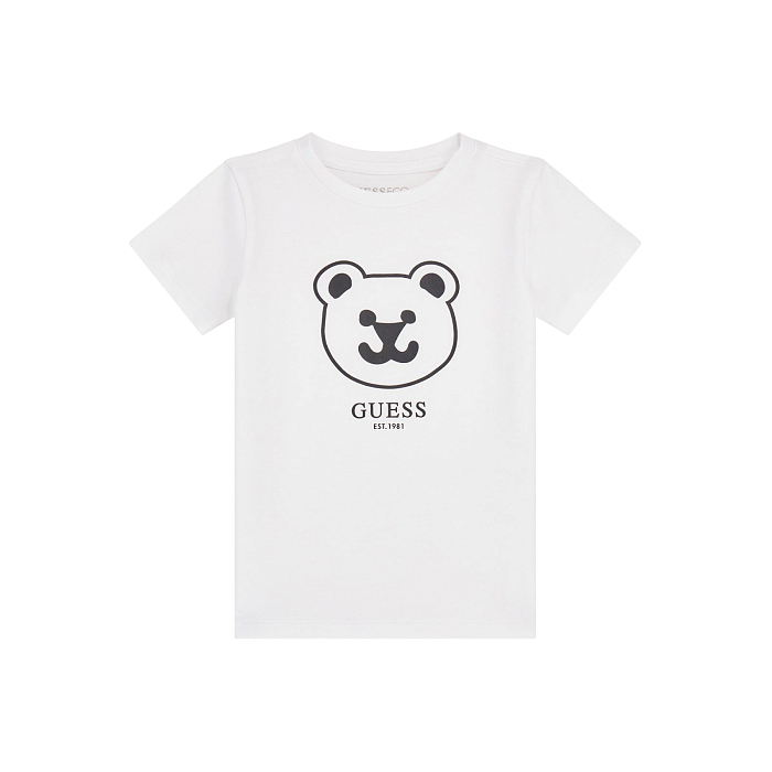 Футболка Guess – это идеальный выбор для мальчиков! Изготовленная из 100% хлопка, она украшена очаровательным принтом медведя с большими ушами и улыбкой. Нежная белая основа с черным принтом медведя создает игривое и в то же время уютное настроение. На фотографиях видна аккуратная черная контрастная окантовка по краю и мягкая текстура ткани. Качество от бренда из США и внимание к деталям делают эту футболку отличным выбором для вашего малыша!