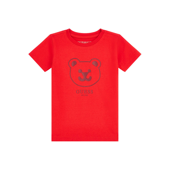 Футболка Guess – это идеальный выбор для мальчиков! Изготовленная из 100% хлопка, она украшена очаровательным принтом медведя с серым логотипом на красном фоне. Нежная красная основа с ярким серым медведем создает стильный и в то же время уютный образ. На фотографиях видна аккуратная серая контрастная окантовка по краю и мягкая текстура ткани. Качество от бренда из США и внимание к деталям делают эту футболку отличным выбором для вашего малыша!