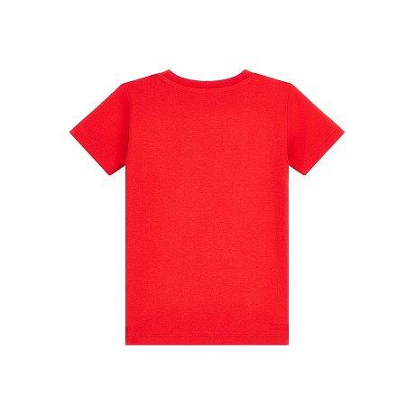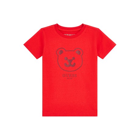 Футболка Guess – это идеальный выбор для мальчиков! Изготовленная из 100% хлопка, она украшена очаровательным принтом медведя с серым логотипом на красном фоне. Нежная красная основа с ярким серым медведем создает стильный и в то же время уютный образ. На фотографиях видна аккуратная серая контрастная окантовка по краю и мягкая текстура ткани. Качество от бренда из США и внимание к деталям делают эту футболку отличным выбором для вашего малыша!