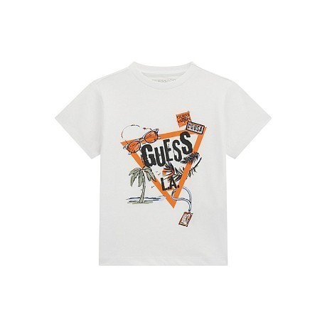 Футболка Guess – это идеальный выбор для мальчиков! Изготовленная из 100% хлопка, она украшена ярким принтом Лос-Анджелеса с солнцезащитными очками и пальмой. Белая основа с черными и оранжевыми акцентами создает яркий и модный образ. На фотографиях видна аккуратная вышивка логотипа Guess и мягкая текстура ткани. Качество от бренда из США и внимание к деталям делают эту футболку отличным выбором для вашего ребенка!