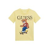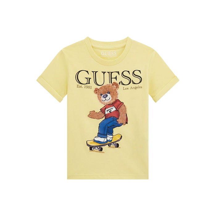 Футболка Guess – это идеальный выбор для мальчиков! Изготовленная из 100% хлопка, она украшена очаровательным принтом медведя на желтом фоне. Милый медведь в красной футболке и джинсах, сидящий на скейтборде, создает неповторимую атмосферу. На фотографиях видна аккуратная вышивка логотипа Guess и надпись "Est. 1981 Los Angeles". Нежная желтая основа с ярким принтом делает эту футболку отличным выбором для вашего ребенка!