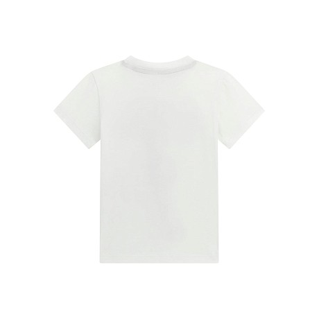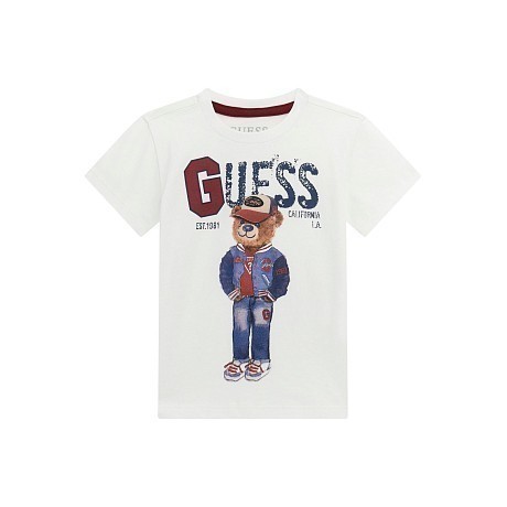 Футболка Guess – это идеальный выбор для юных модников! Изготовленная из 100% хлопка, она украшена очаровательным принтом медведя в кепке и куртке, а также надписью Guess. Белый фон с яркими красными и синими акцентами создает стильный и современный образ. На фотографиях видна аккуратная красная окантовка по краю и мягкая текстура ткани. Качество от бренда из США и внимание к деталям делают эту футболку отличным выбором для вашего мальчика!