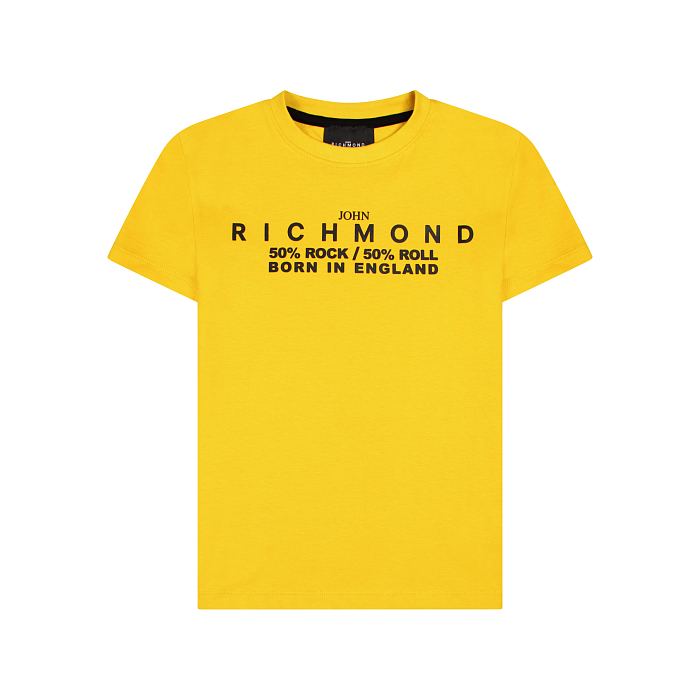 Футболка John Richmond – это идеальный выбор для юных модников! Изготовленная из 100% хлопка, она украшена стильным принтом с надписью "50% ROCK / 50% ROLL BORN IN ENGLAND". Яркий желтый цвет и черный принт создают яркий и стильный образ. На фотографии видна аккуратная вышивка по краю и мягкая текстура ткани. Качество от бренда из Англии и внимание к деталям делают эту футболку отличным выбором для вашего ребенка!