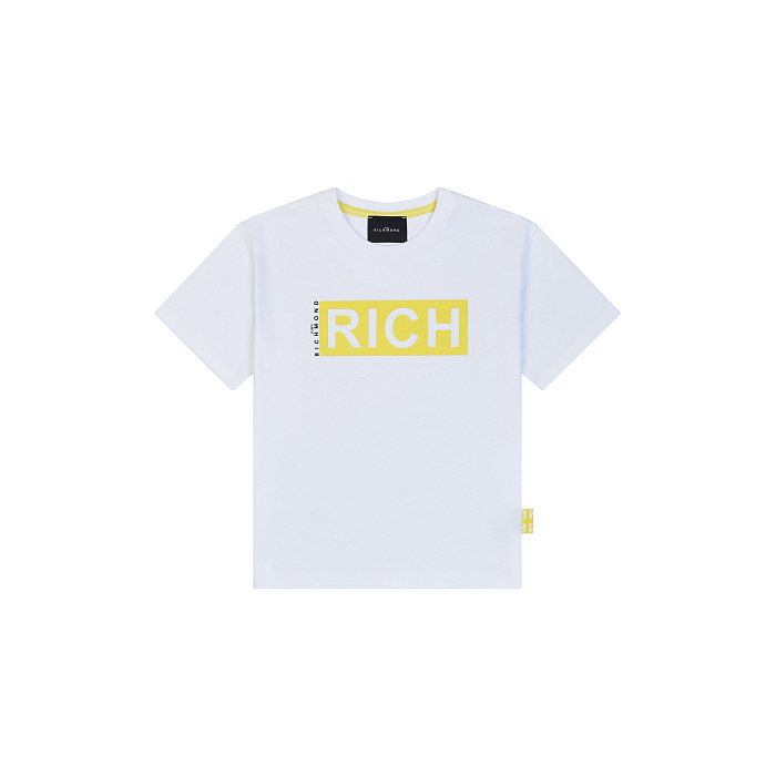 Футболка Richmond – это идеальный выбор для юных модников! Изготовленная из 100% хлопка, она украшена ярким принтом RICH в желтом цвете. Нежная белая основа с контрастным желтым принтом создает яркий и современный образ. На фотографиях видна аккуратная желтая окантовка по краю и мягкая текстура ткани. Качество от бренда Richmond и внимание к деталям делают эту футболку отличным выбором для вашего ребенка!