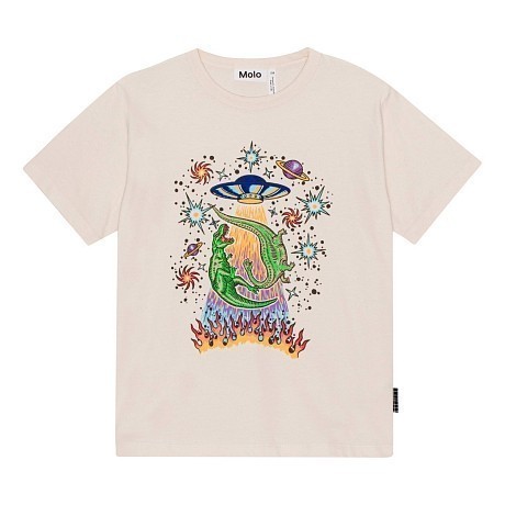 Футболка Molo – это идеальный выбор для юных модников! Изготовленная из 100% натурального хлопка, она украшена ярким принтом с динозаврами, космическими ракетами и звездами на светло-розовом фоне. Нежная текстура ткани и аккуратная контрастная окантовка по краю создают стильный и комфортный образ. Качество от бренда из Дании и внимание к деталям делают эту футболку отличным выбором для вашего ребенка!