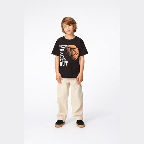 Футболка Molo – это идеальный выбор для юных баскетболистов! Изготовленная из 100% натурального хлопка, она украшена ярким принтом баскетбола и надписью Peace Out. Черная основа с оранжевым баскетболом и белой надписью создает модный и спортивный образ. На фотографиях видна аккуратная белая окантовка по краю и мягкая текстура ткани. Качество от датского бренда и внимание к деталям делают эту футболку отличным выбором для вашего активного мальчика!
