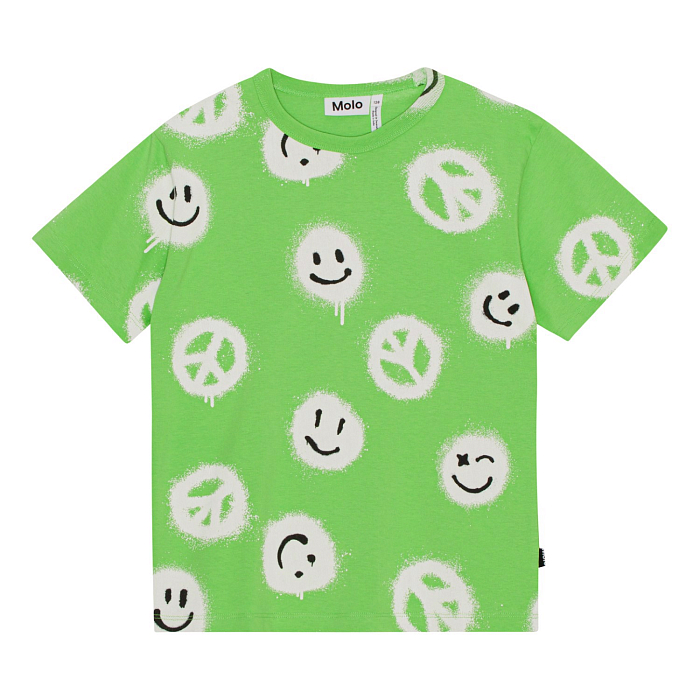 Футболка Molo – это идеальный выбор для мальчиков! Изготовленная из 100% натурального хлопка, она украшена яркими белыми принтами смайликов и знаков мира на зеленом фоне. Нежная текстура ткани и удобная посадка делают эту футболку отличным выбором для вашего ребенка. На фотографиях видны аккуратные черные контрастные элементы на фоне белых принтов, а также мягкая текстура ткани. Качество от бренда из Дании и внимание к деталям делают эту футболку отличным выбором для вашего малыша!