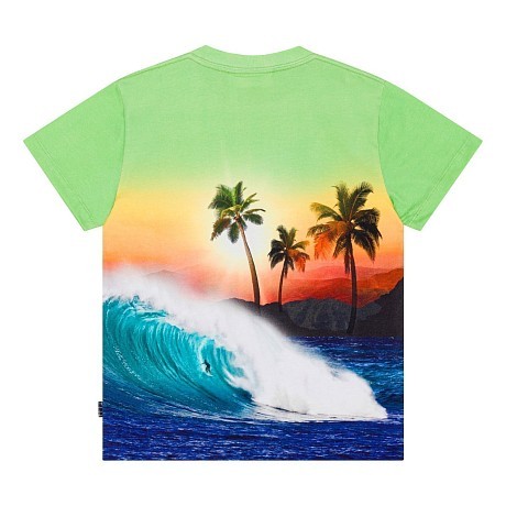 Футболка Molo – это идеальный выбор для мальчиков! Изготовленная из 100% натурального хлопка, она украшена ярким принтом пальм и волны на фоне заката. Зеленый цвет основы с яркими элементами создает ощущение летнего отдыха и приключений. На фотографиях видны аккуратные края, мягкая текстура ткани и контрастный принт. Качество от бренда из Дании и внимание к деталям делают эту футболку отличным выбором для вашего мальчика!