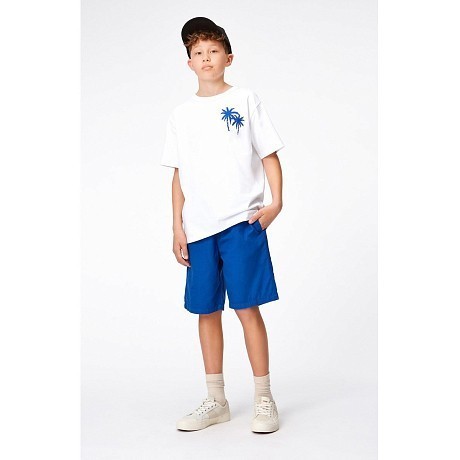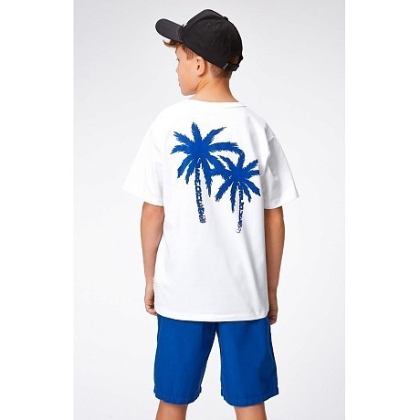 Футболка Molo – это идеальный выбор для летних прогулок! Изготовленная из 100% натурального хлопка, она украшена ярким принтом двух пальмовых деревьев на белом фоне. Нежная белая ткань с контрастными синими пальмами создает легкий и стильный образ. На фотографиях видна аккуратная синяя контрастная окантовка по краю и мягкая текстура ткани. Качество от бренда из Дании и внимание к деталям делают эту футболку отличным выбором для вашего мальчика!
