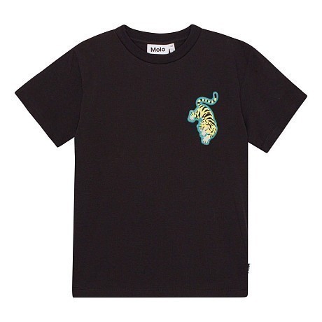 Футболка Molo – это идеальный выбор для юных модников! Изготовленная из 100% натурального хлопка, она украшена ярким принтом тигра на передней части и красочным рисунком аркадной машины на спине. Черная основа с яркими цветами создает стильный и современный образ. На фотографиях видна аккуратная окантовка по краю и мягкая текстура ткани. Качество от бренда из Дании и внимание к деталям делают эту футболку отличным выбором для вашего ребенка!