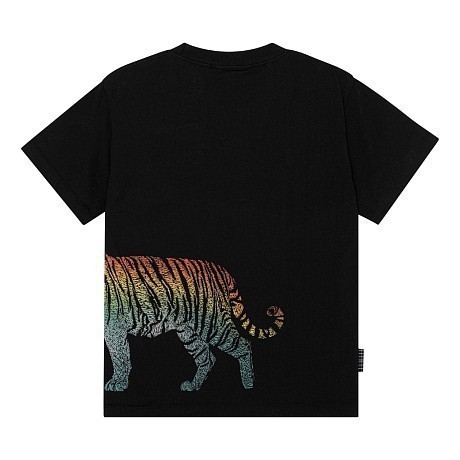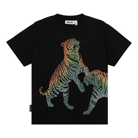 Футболка Molo – это стильный и комфортный выбор для мальчиков! Изготовленная из 100% натурального хлопка, она украшена ярким принтом двух тигров с радужным эффектом. На передней части футболки изображены тигры, а на спине – тигр с виду сзади. Нежная черная основа с яркими радужными тиграми создает игривое и модное настроение. На фотографиях видна аккуратная белая окантовка по краю и мягкая текстура ткани. Качество от датского бренда и внимание к деталям делают эту футболку отличным выбором для вашего ребенка!