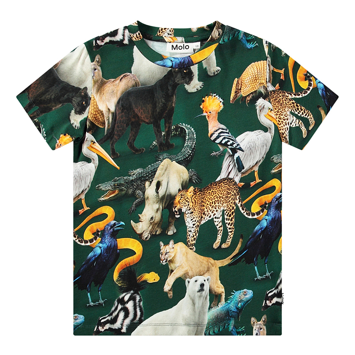 Футболка Molo – это идеальный выбор для юных природных любителей! Изготовленная из 100% натурального хлопка, она украшена ярким принтом дикой природы. На футболке изображены различные животные и птицы, такие как леопарды, зебры, белые медведи, змеи и другие. Нежная текстура ткани и удобная посадка делают эту футболку комфортной и стильной. Качество от датского бренда Molo и внимание к деталям делают эту футболку отличным выбором для вашего ребенка!