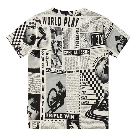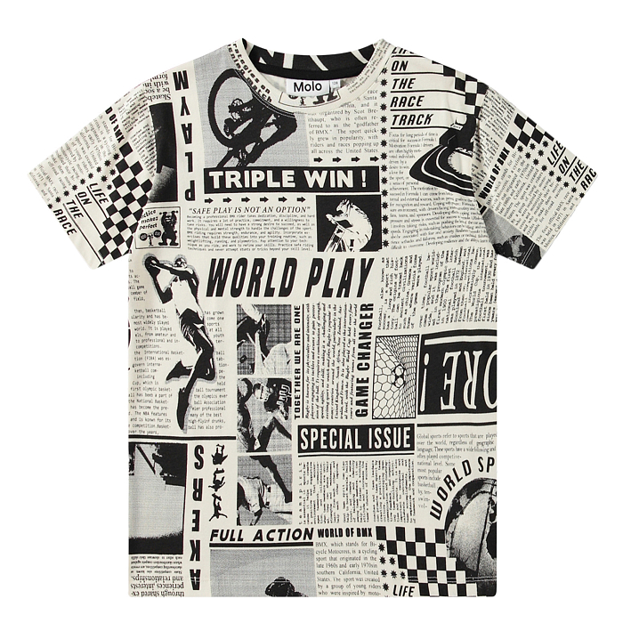 Футболка Molo – это идеальный выбор для активных мальчиков! Изготовленная из 100% натурального хлопка, она украшена оригинальным принтом спортивных новостей и шахматных полей. На футболке видны различные спортивные сцены, такие как футбол, велоспорт, баскетбол и другие виды спорта, а также тексты, напоминающие о спортивных новостях. Нежная белая основа с черными акцентами создает стильный и современный образ. Качество от бренда из Дании и внимание к деталям делают эту футболку отличным выбором для вашего мальчика!