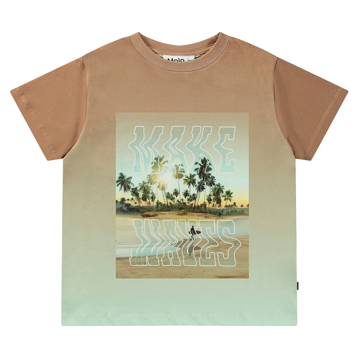 Футболка Molo – это идеальный выбор для юных модников! Изготовленная из 100% натурального хлопка, она украшена очаровательным принтом пальм и надписью "Make Waves". Коричневый цвет с легким градиентом создает нежный и стильный наряд. На фотографиях видна аккуратная вышивка логотипа Molo на воротнике и мягкая текстура ткани. Качество от бренда из Дании и внимание к деталям делают эту футболку отличным выбором для вашего мальчика!