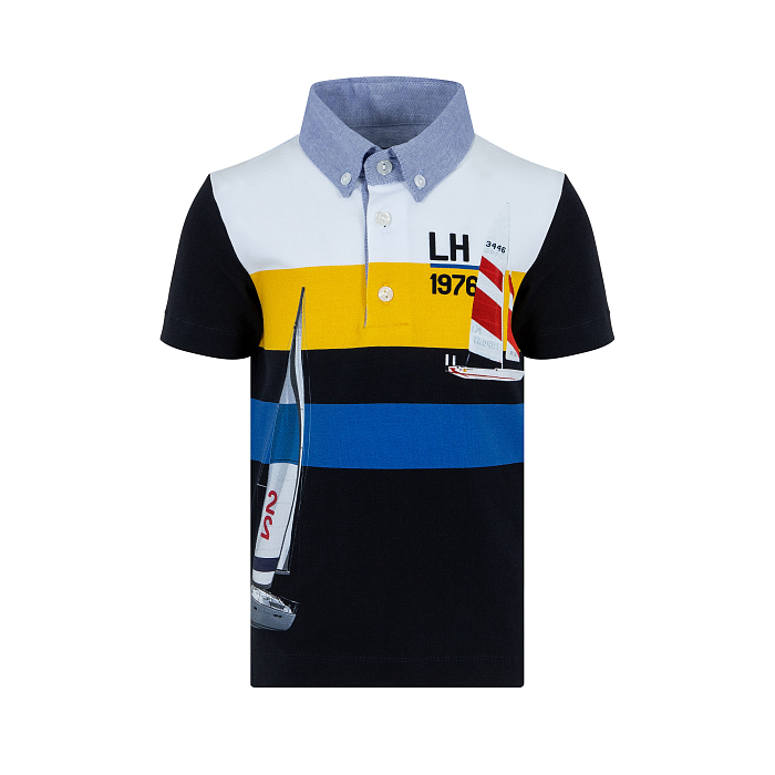 Трикотажная рубашка-поло Lapin House – это идеальный выбор для юных моряков! Изготовленная из 97% хлопка и 3% лайкры, она украшена ярким принтом с изображением яхт на фоне моря. Темно-синий цвет основы с белыми, желтыми и синими полосами создает стильный и современный образ. На фотографиях видна аккуратная голубая окантовка воротника и мягкая текстура ткани. Качество от бренда из Греции и внимание к деталям делают эту рубашку отличным выбором для вашего мальчика!