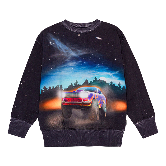 Джемпер Molo – это идеальный выбор для юных гонщиков! Изготовлен из 100% натурального хлопка, он украшен ярким принтом гоночного автомобиля с огнями и дымом на фоне звездного неба. Нежная черная основа с яркими красными и синими акцентами создает игривое и в то же время стильное настроение. На фотографиях видна аккуратная черная окантовка по краю и мягкая текстура ткани. Качество от бренда из Дании и внимание к деталям делают эту модель отличным выбором для вашего ребенка!
