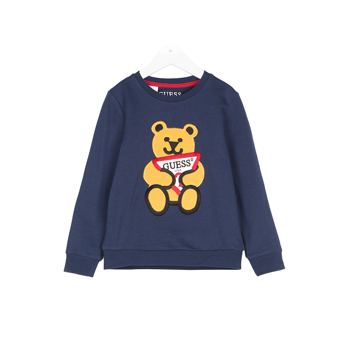 Джемпер Guess – это идеальный выбор для мальчиков 2-4 лет! Изготовленный из 100% хлопка, он украшен очаровательным принтом медведя с надписью Guess. Мягкая темно-синяя основа с ярким медведем создает уютное и стильное настроение. На фотографиях видна аккуратная красная окантовка воротника и мягкая текстура ткани. Качество от бренда из США и внимание к деталям делают этот джемпер отличным выбором для вашего ребенка!