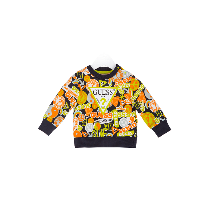Джемпер Guess – это идеальный выбор для юных модников! Изготовленный из 100% хлопка, он украшен ярким принтом с символикой бренда, включая логотип Guess, надписи и различные узоры. Джемпер идеально подойдет для мальчиков, которые ценят комфорт и стиль. На фотографиях видна аккуратная окантовка по краю и мягкая текстура ткани. Качество от американского бренда Guess делает этот джемпер отличным выбором для вашего ребенка!
