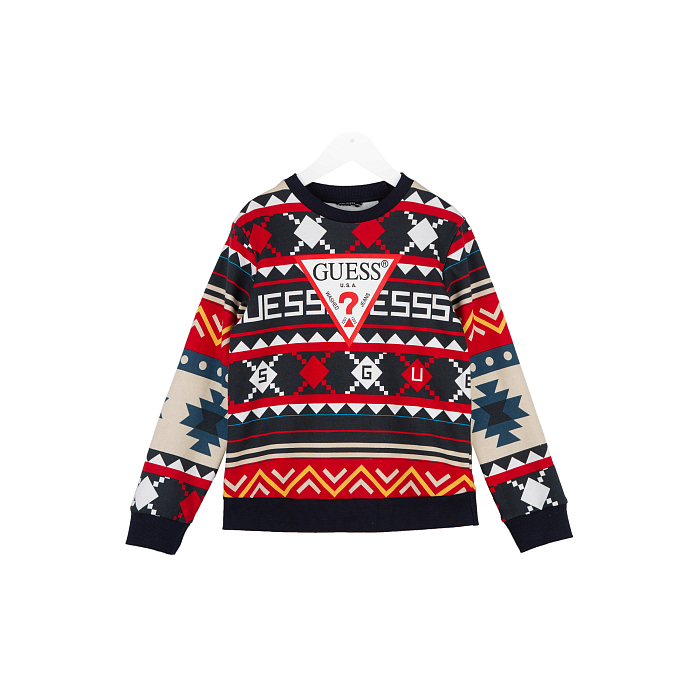 Джемпер Guess – это идеальный выбор для юных модников! Изготовлен из 100% хлопка, он украшен ярким принтом в этническом стиле с логотипом Guess. Джемпер идеально подойдет для мальчиков, которые ценят комфорт и стиль. На фотографиях видны яркие красные, синие и белые геометрические узоры, а также крупный логотип Guess в центре. Нежная текстура ткани и удобная посадка делают этот джемпер отличным выбором для вашего ребенка!