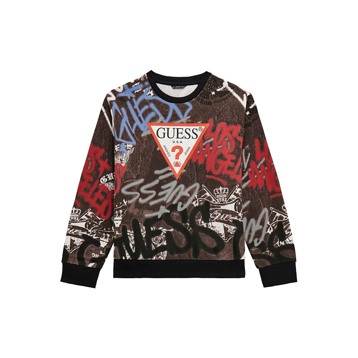 Джемпер Guess – это идеальный выбор для юных модников! Изготовленный из 100% хлопка, он украшен ярким принтом граффити и логотипом Guess. Черный фон с красными, синими и белыми надписями создает современный и необычный стиль. На фотографиях видна аккуратная черная окантовка по краю и мягкая текстура ткани. Качество от бренда из США и внимание к деталям делают этот джемпер отличным выбором для вашего ребенка!