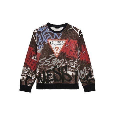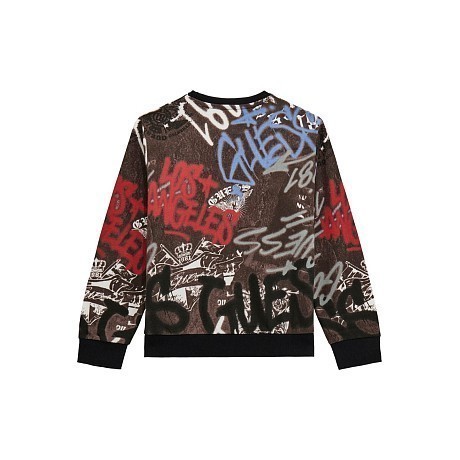 Джемпер Guess – это идеальный выбор для юных модников! Изготовленный из 100% хлопка, он украшен ярким принтом граффити и логотипом Guess. Черный фон с красными, синими и белыми надписями создает современный и необычный стиль. На фотографиях видна аккуратная черная окантовка по краю и мягкая текстура ткани. Качество от бренда из США и внимание к деталям делают этот джемпер отличным выбором для вашего ребенка!