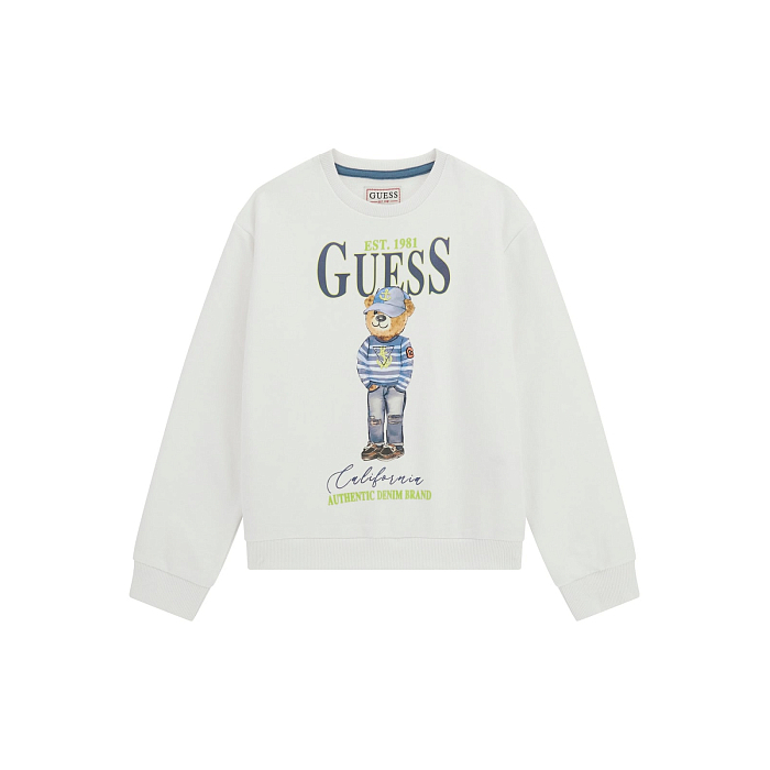 Джемпер Guess – это идеальный выбор для юных модников! Изготовленный из 100% хлопка, он украшен очаровательным принтом медведя в полоску и надписью Guess. Белый цвет создает нежное и стильное настроение. На фотографиях видна аккуратная голубая окантовка по краю и мягкая текстура ткани. Качество от бренда из США и внимание к деталям делают этот джемпер отличным выбором для вашего мальчика!