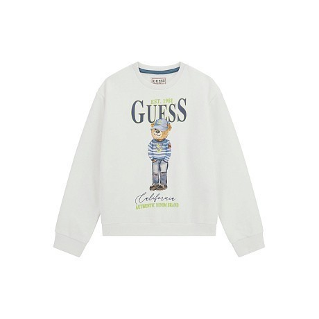 Джемпер Guess – это идеальный выбор для юных модников! Изготовленный из 100% хлопка, он украшен очаровательным принтом медведя в полоску и надписью Guess. Белый цвет создает нежное и стильное настроение. На фотографиях видна аккуратная голубая окантовка по краю и мягкая текстура ткани. Качество от бренда из США и внимание к деталям делают этот джемпер отличным выбором для вашего мальчика!