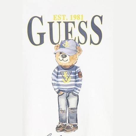 - 🎨 Дизайн: медведь в полоску, надпись Guess, голубая окантовка