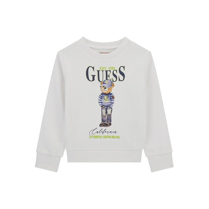 Джемпер Guess – это идеальный выбор для вашего юного модника! Изготовленный из 100% хлопка, он украшен очаровательным принтом медведя в шляпе и с надписью Guess. Белая основа с ярким принтом создает яркий и стильный образ. На фотографиях видна аккуратная окантовка по краю и мягкая текстура ткани. Качество от бренда Guess и внимание к деталям делают этот джемпер отличным выбором для вашего ребенка!